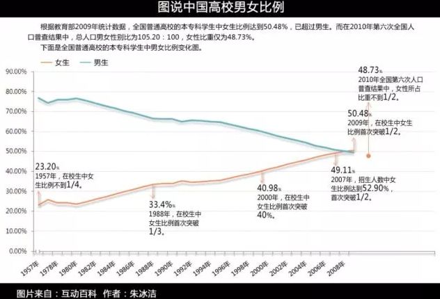另一方面,女性的受教育程度不断提高,高校学生的女性占比在数十年内不断提高,并在2009年首次超过男性